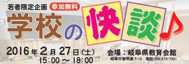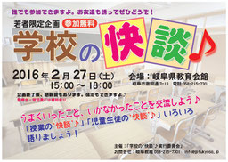 2016/01/26 【お知らせ】青年企画「学校の‘快談’」(2/27) とき 2016年2月27日(土) 時間 15時00分~18時00分 会場 岐阜県教育会館 岐阜市徹明通7丁目13 058-215-7301 料金 無料 主催 岐阜教組の若者たち 問合せ 058-215-7301(岐阜教組) ≫チラシダウンロード うまくいったこと、いかなかったことを交流しよう 「授業の快談」「児童生徒の快談」いろいろ語りましょう 誰でも参加できますよ。お友達も誘って、ぜひどうぞ! tagPlaceholderカテゴリ: 催し, 青年部, お知らせ
